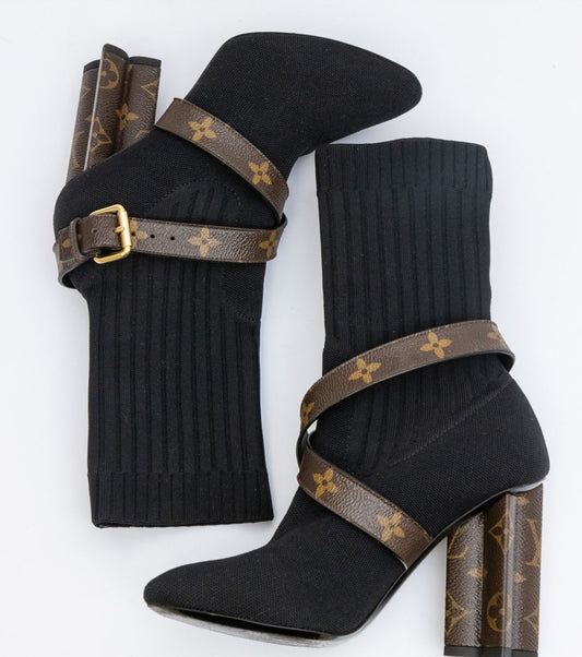 LOUIS VUITTON Black/Brown Leather and Monogram Canvas Pointed Toe Block Heel Pumps – Size 37.5 | Made in Italy
