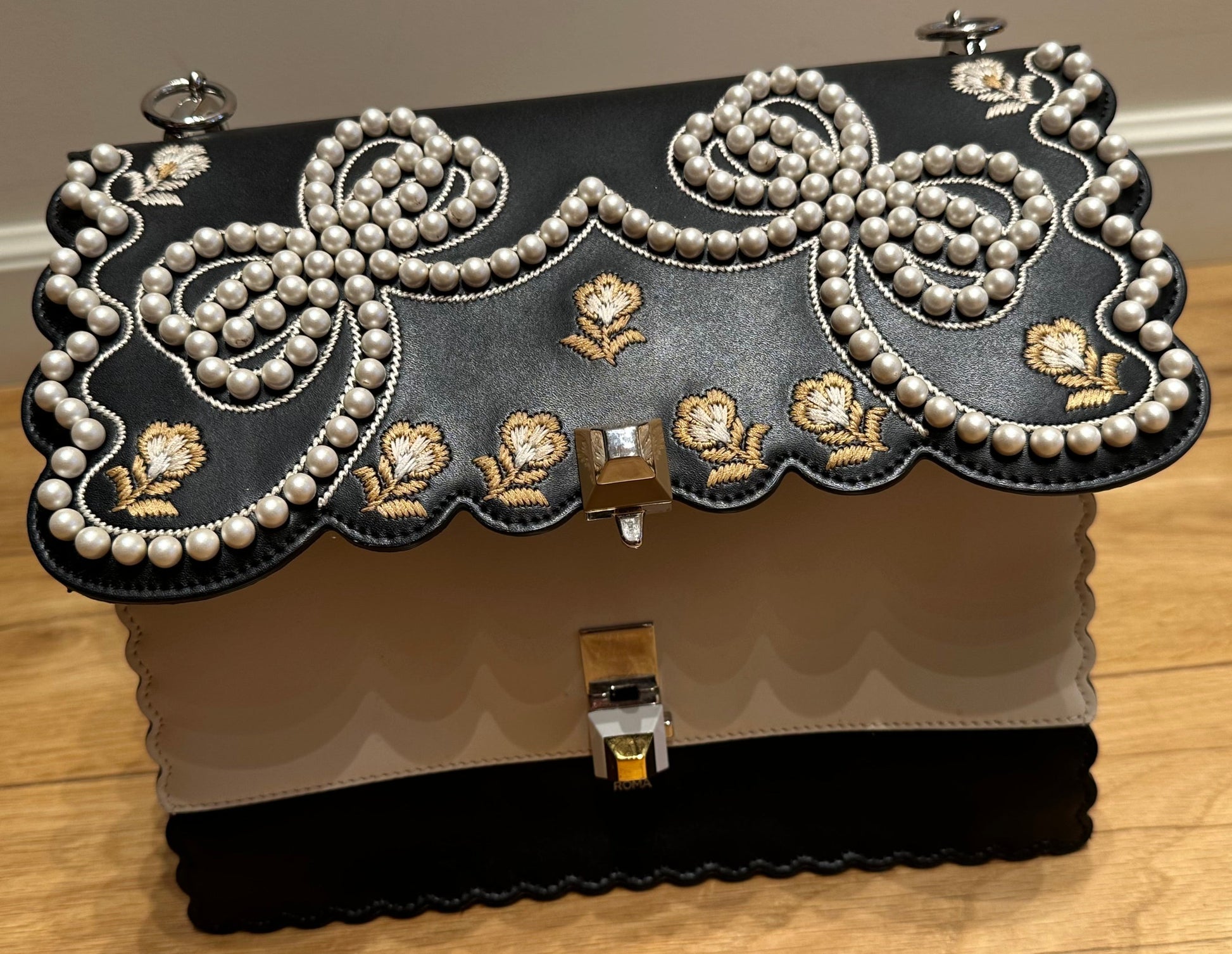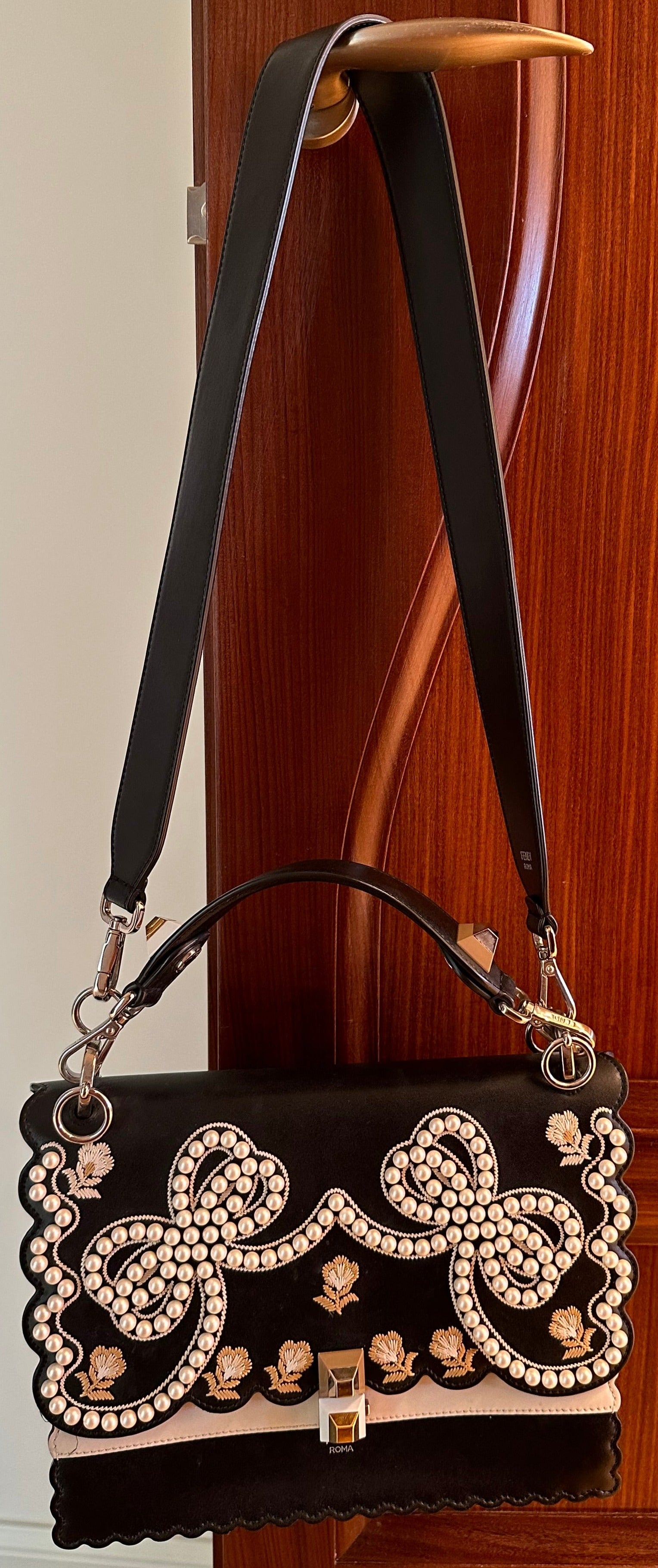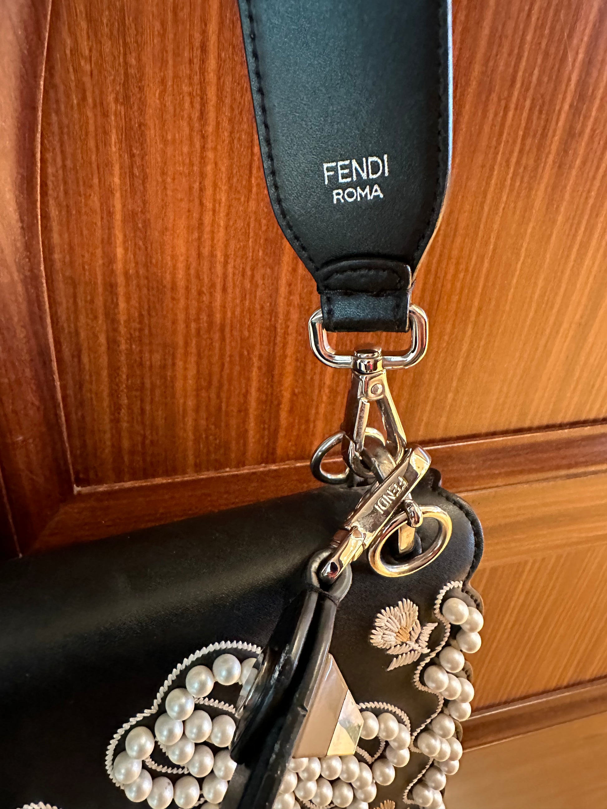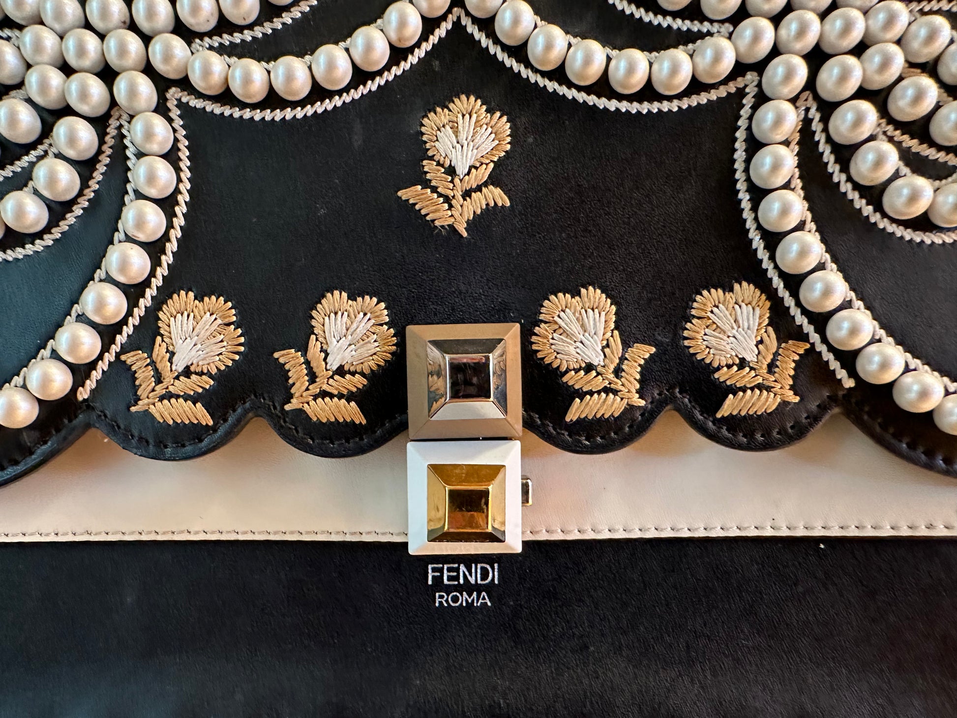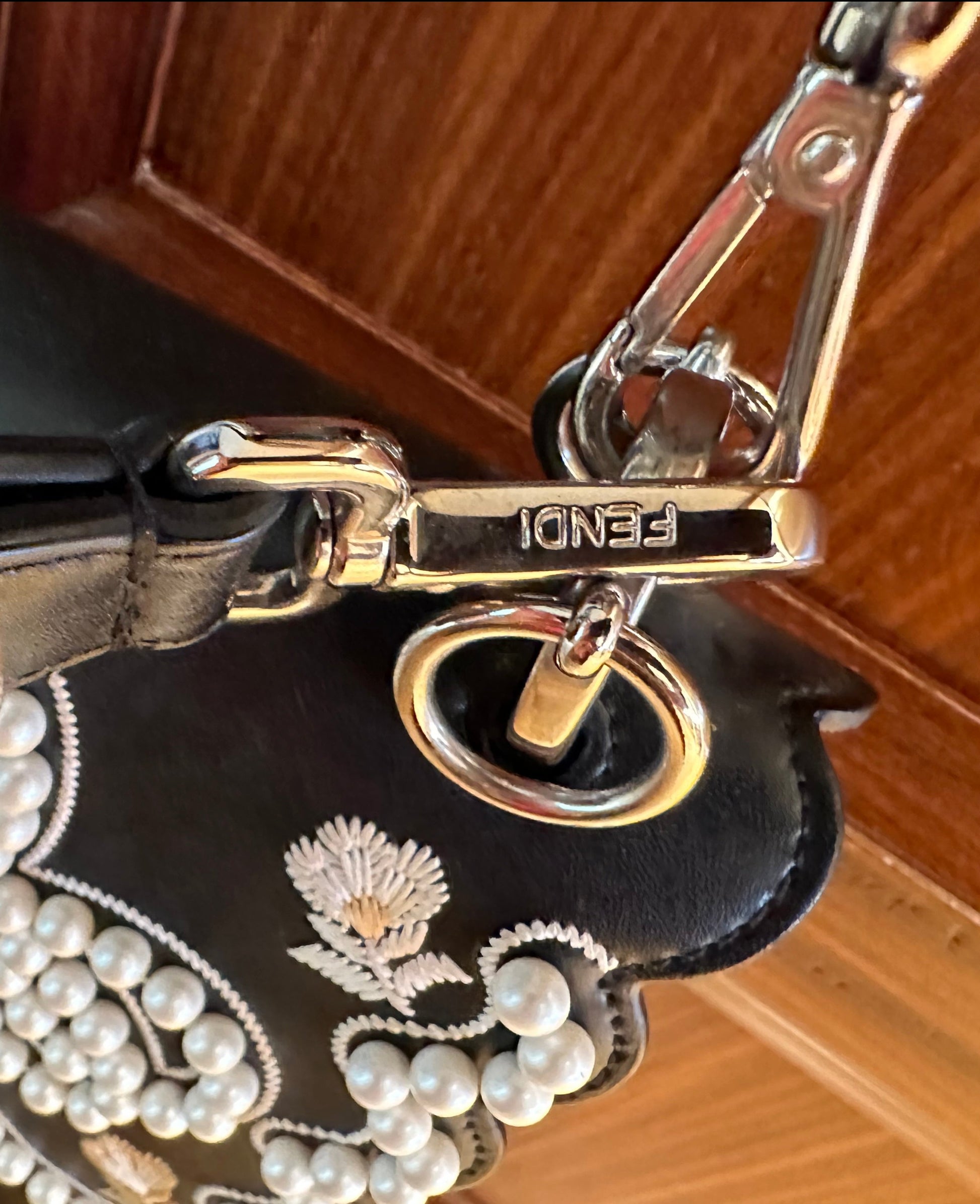הוסף נופך של יוקרה לאנסמבל שלך עם תיק כתף עור שחור מדהים זה של FENDI המעוטר בפנינים. תוצרת איטליה עם אומנות ללא דופי, תיק כתף מעוצב זה מתהדר במראה עור שחור נצחי ועיטורי פנינים אלגנטיים, משדרים תחכום וסטייל. השילוב המושלם של אופנה ופונקציונליות, תיק זה מציע שפע של מקום לשאת את הדברים החיוניים שלך.