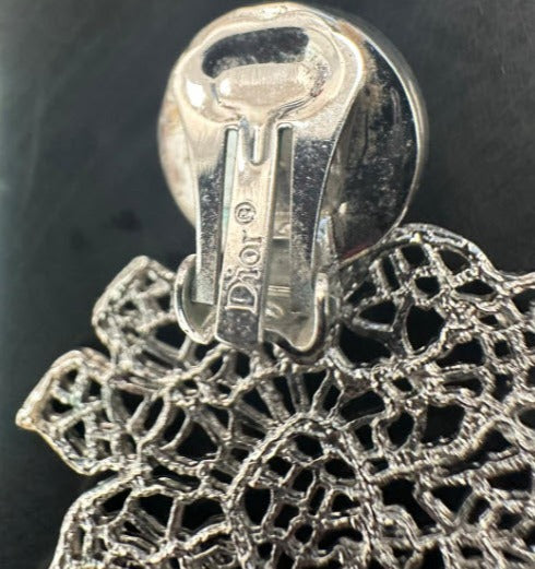 DIOR Silver Filigree Tassel Clips Earrings with Large White Stone and D Letter