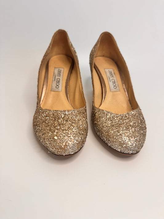 JIMMY CHOO Metallic Gold Coarse Glitter Billie Block Heel Pumps Size 38