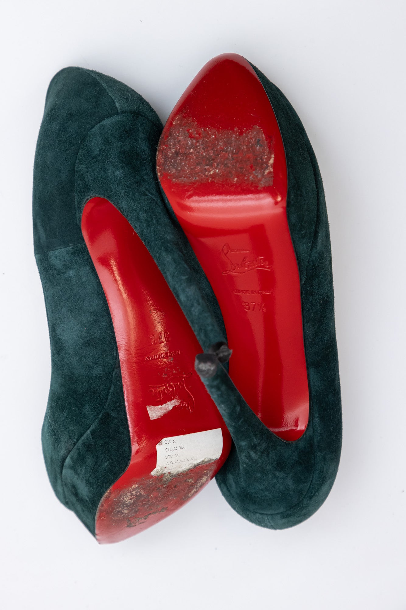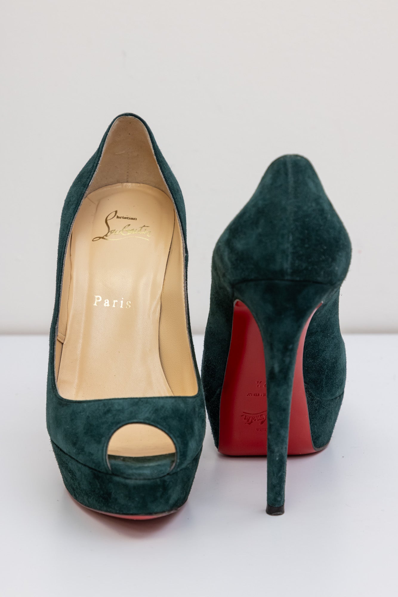 Подчеркните свой стиль пленительным очарованием этих зеленых замшевых туфель с открытым носком и красной подошвой CHRISTIAN LOUBOUTIN. Эти дизайнерские туфли-лодочки, изготовленные в Италии с максимальным мастерством, отличаются роскошным верхом из зеленой замши, излучающим изысканность и очарование. Дизайн с открытым носком добавляет нотку очарования и универсальности любому наряду, идеально подходящем как для официальных мероприятий, так и для вечеринок.