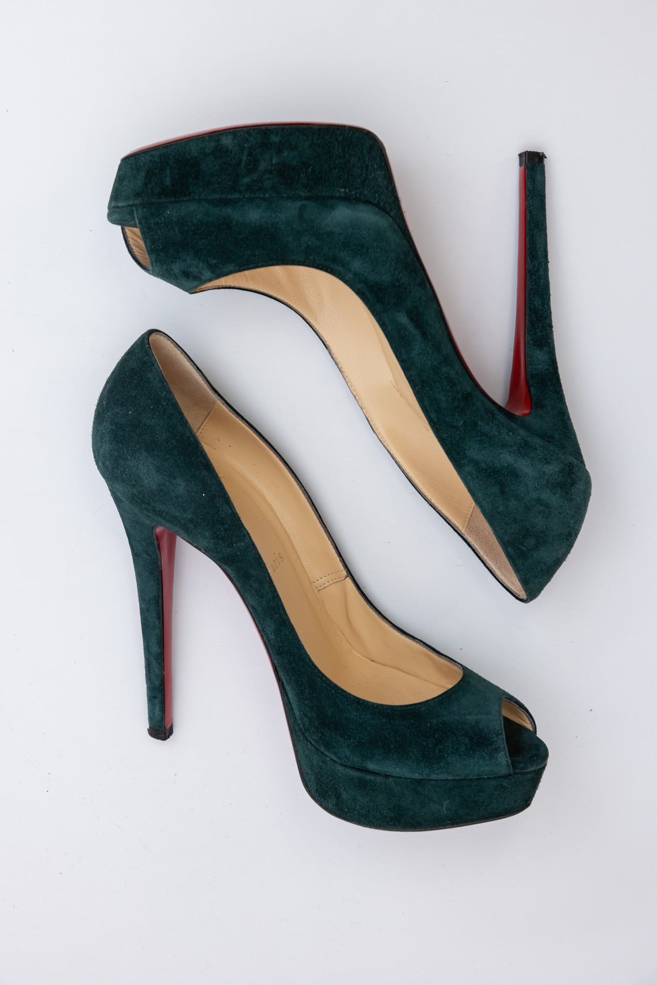 CHRISTIAN LOUBOUTIN Зеленые замшевые туфли с красной подошвой и открытым носком