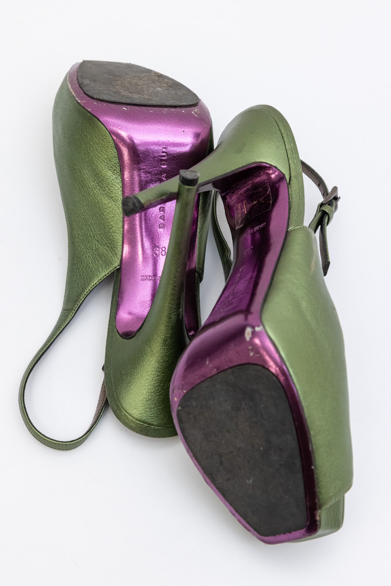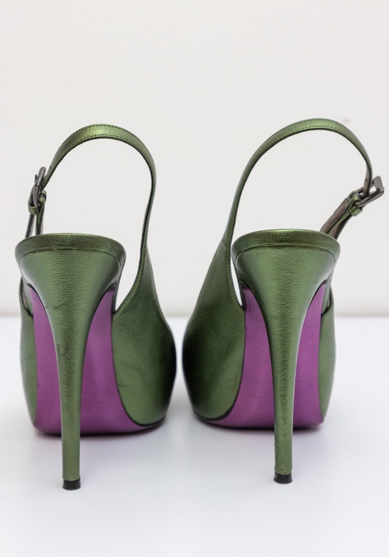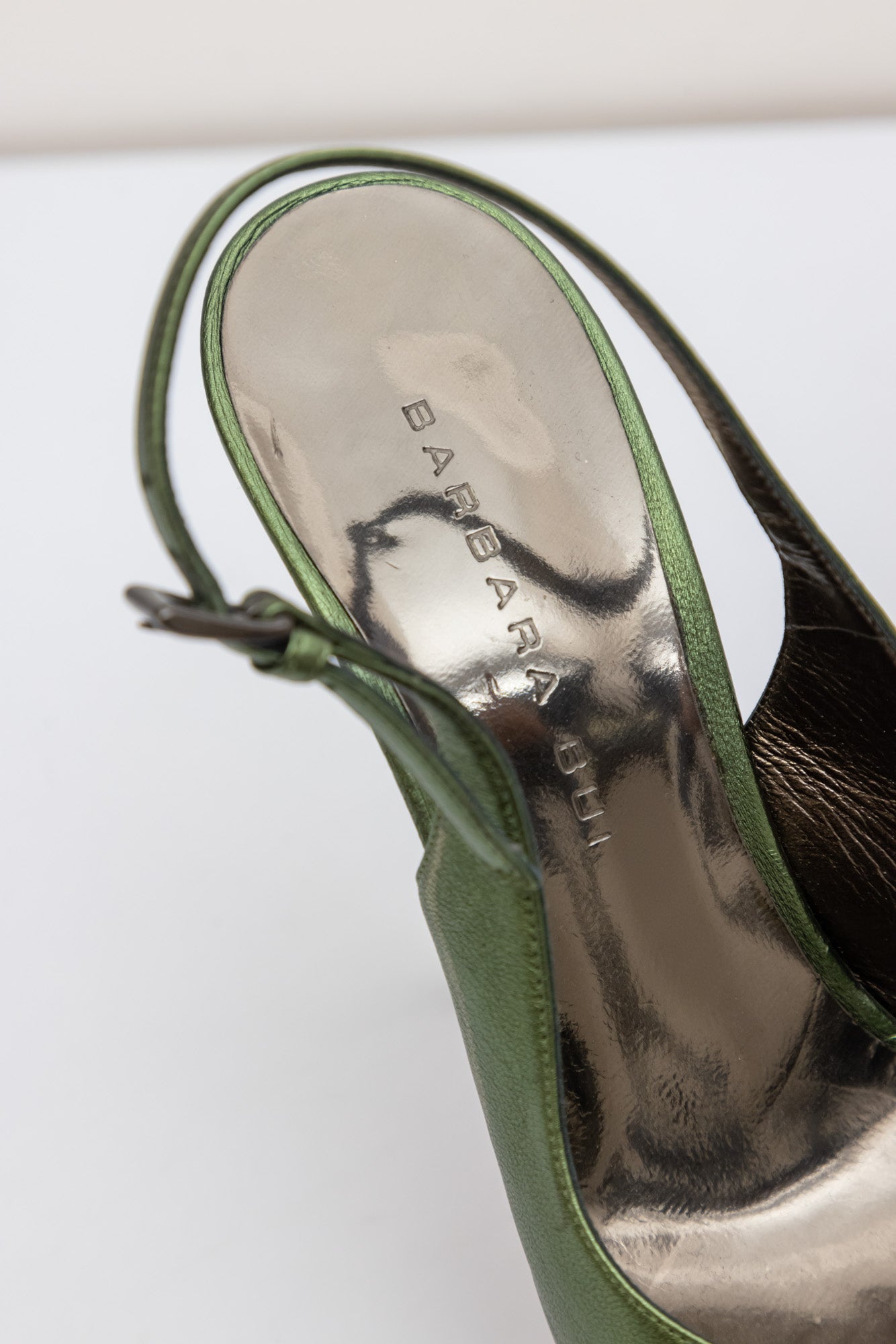 Сделайте шаг навстречу изысканности с зелеными кожаными туфлями-лодочками с ремешком на пятке с ремешком на пятке BARBARA BUI. Сделанные в Италии, эти туфли-лодочки излучают элегантность и стиль благодаря верху из кожи зеленого цвета с эффектом металлик.