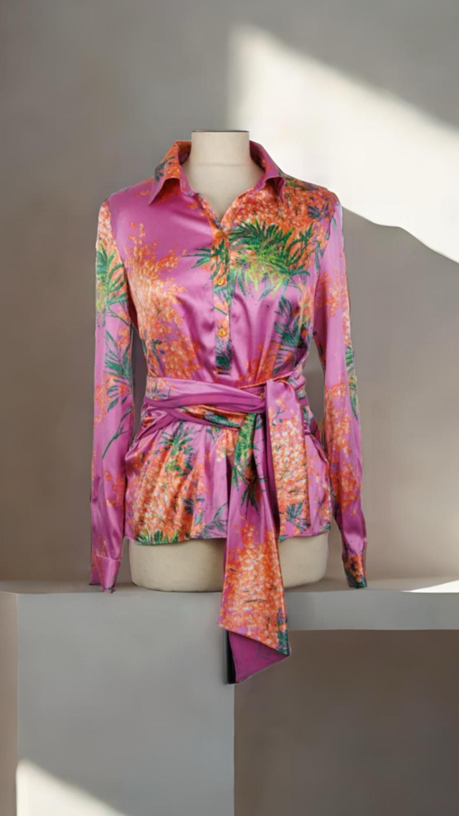 Привнесите нотку элегантности и изысканности в свой гардероб с этой розовой шелковой рубашкой-кимоно BLUMARINE с цветочным принтом. Сделанная в Италии с кропотливой работой, эта дизайнерская рубашка украшена пленительным цветочным принтом на роскошной розовой шелковой ткани, источающей очарование и изящество. Силуэт в стиле кимоно и пояс кимоно придают образу стильный и привлекательный вид, делая его универсальным и шикарным дополнением к вашей коллекции.