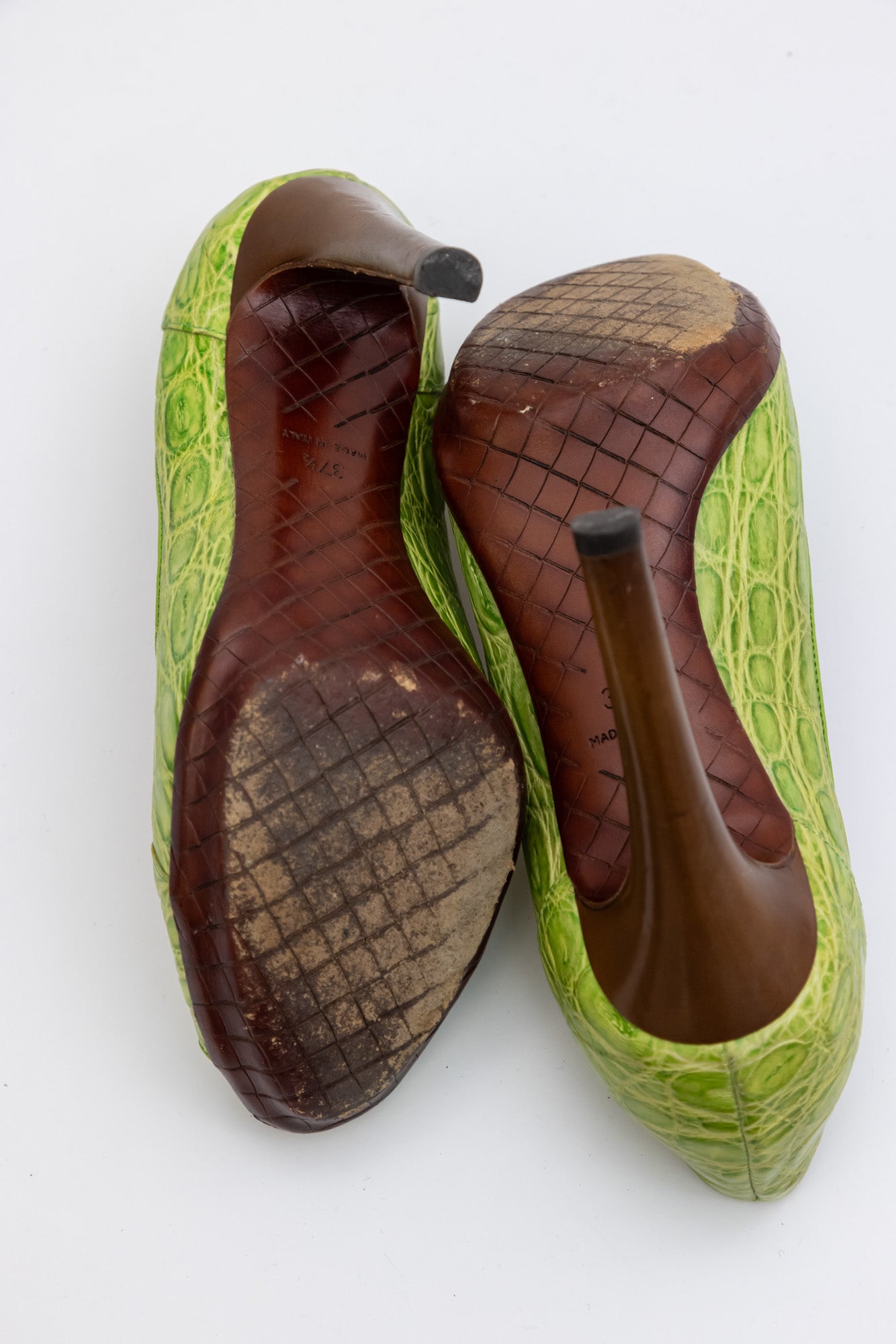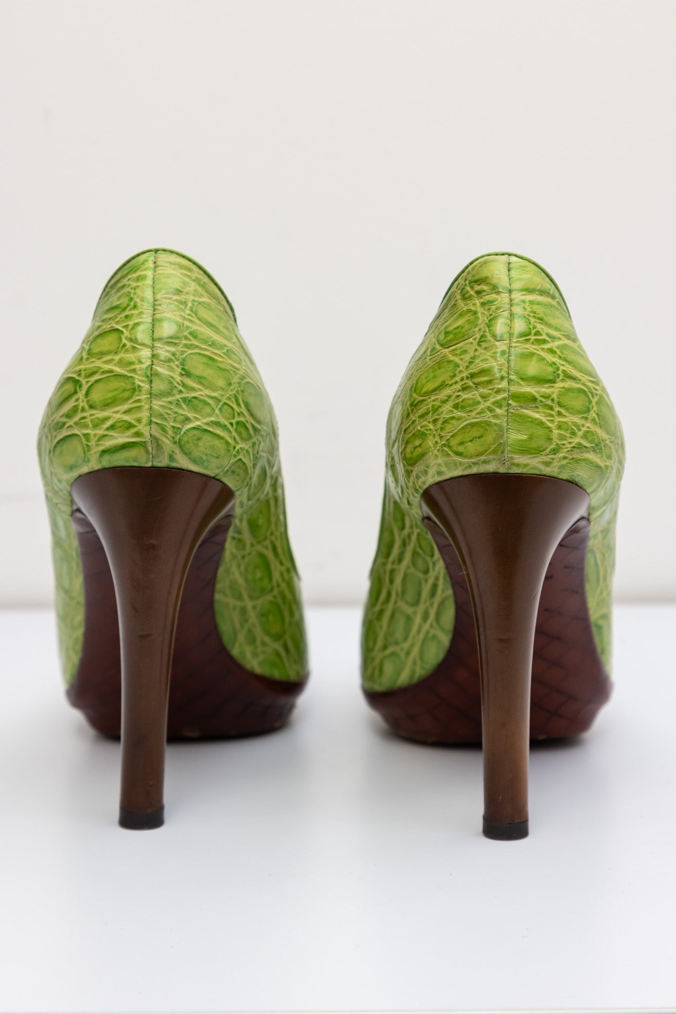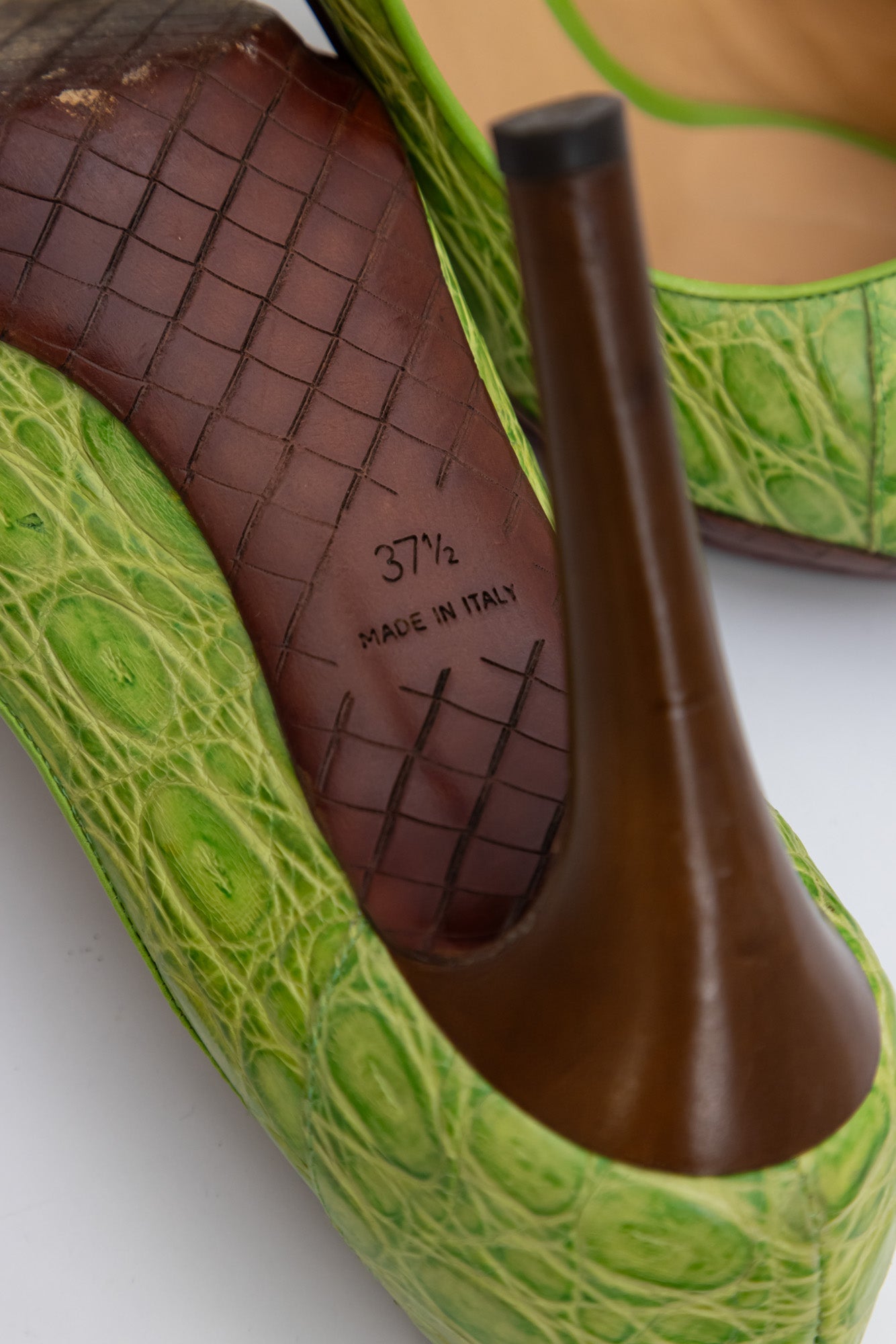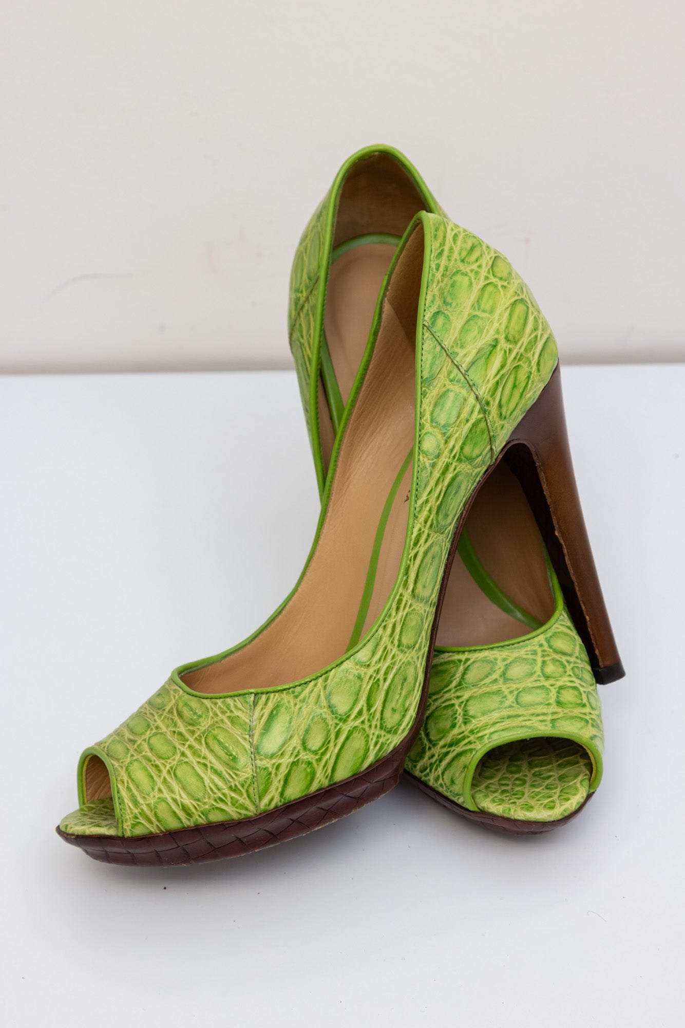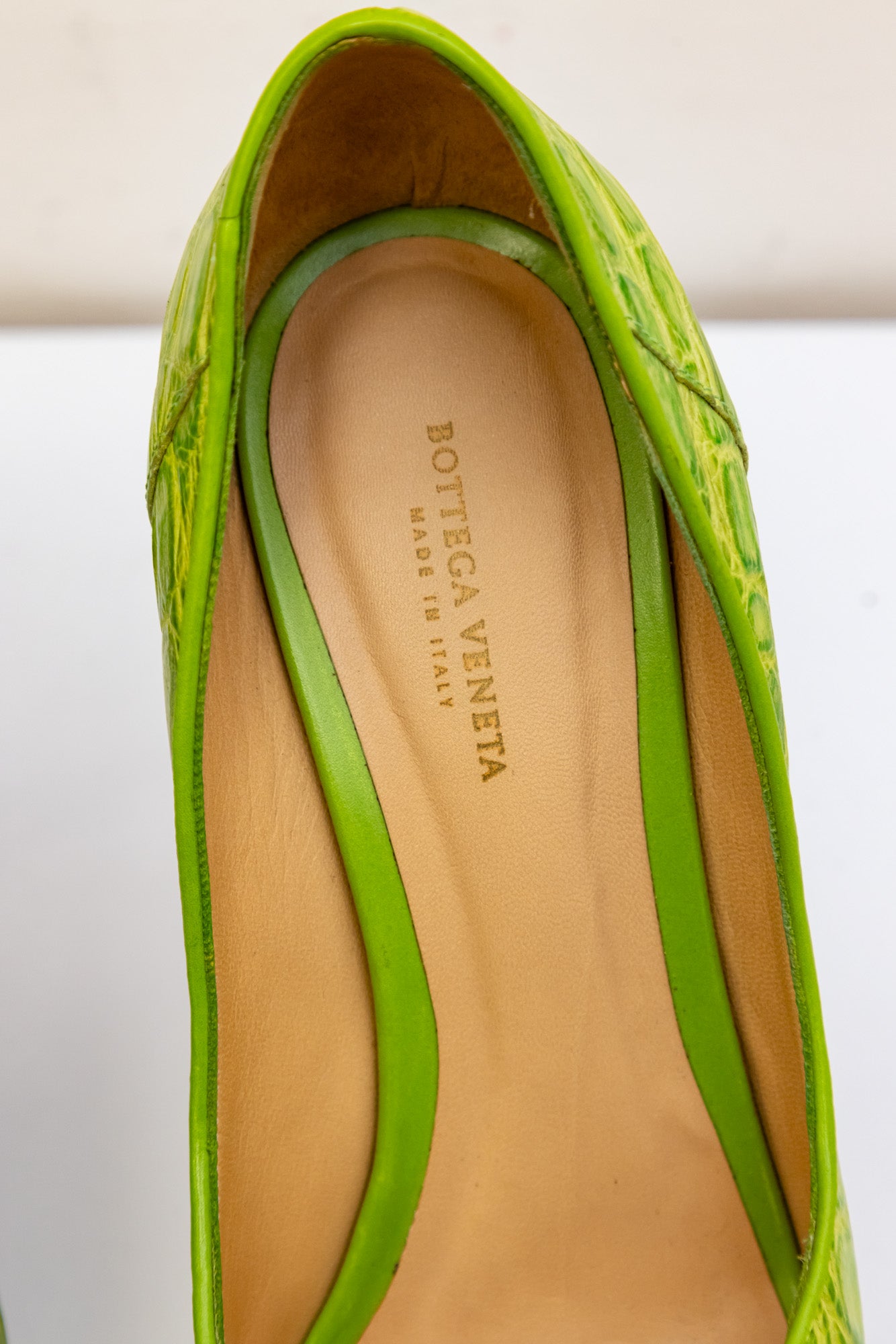 Зеленые туфли-лодочки BOTTEGA VENETA из кожи аллигатора с открытым носком — итальянская роскошь в лучшем виде! Окунитесь в роскошь с этими изысканными туфлями-лодочками. Изготовленные в Италии, они имеют каблук 11 см, внешнюю сторону из кожи аллигатора и подкладку из мягкой кожи для комфорта. Идеальное состояние.
