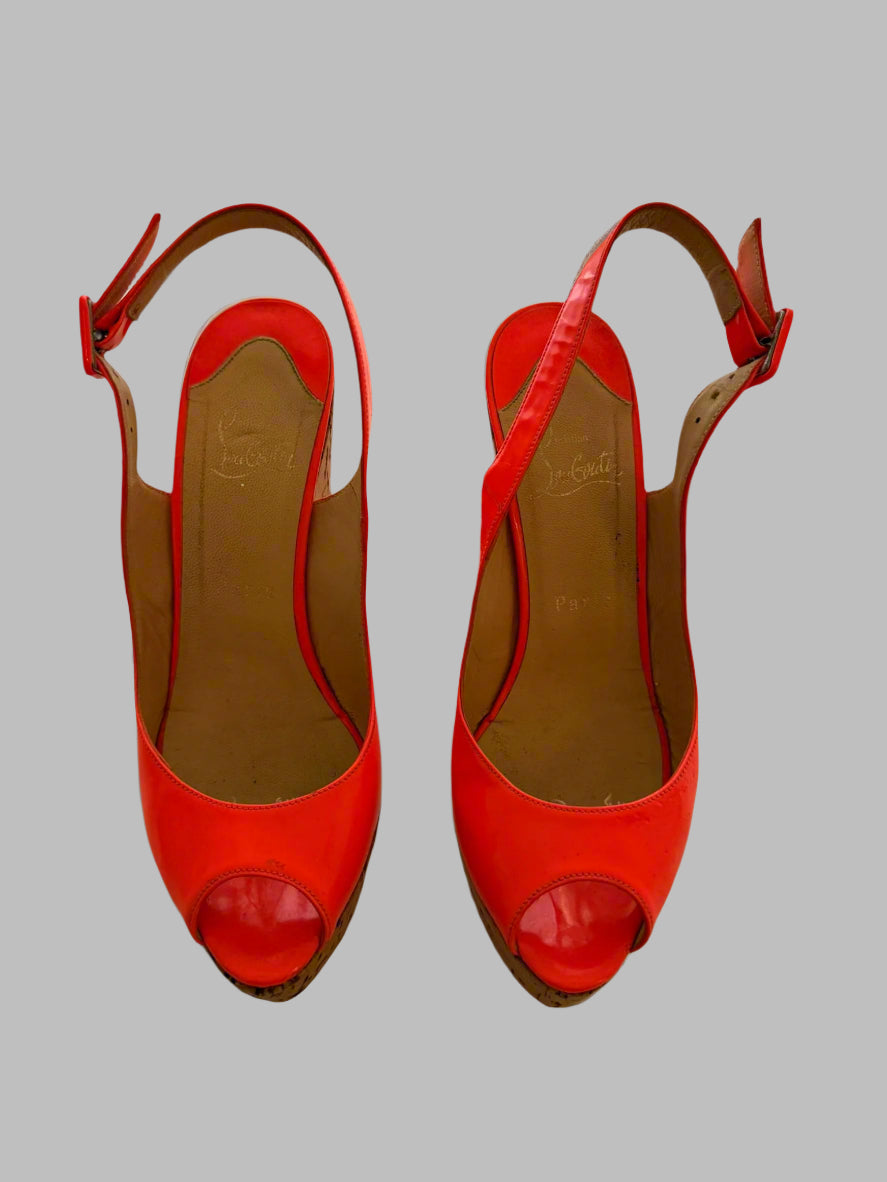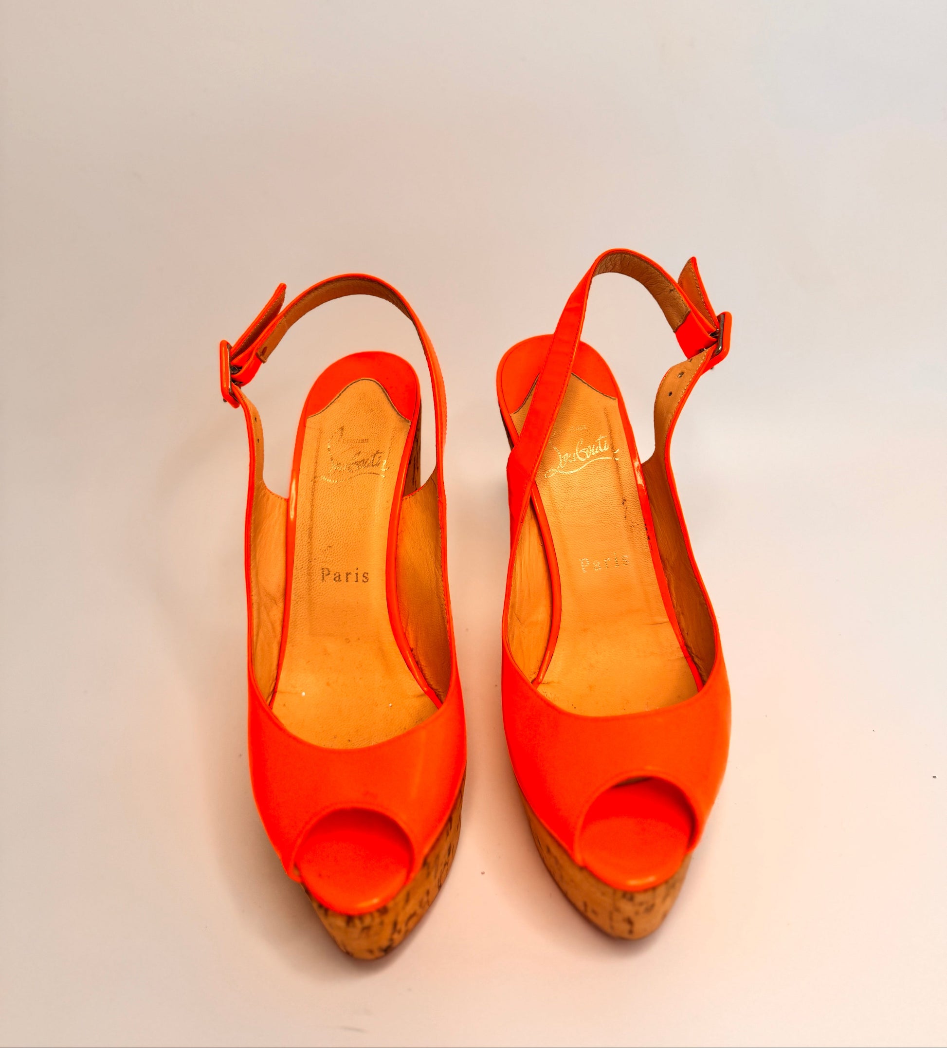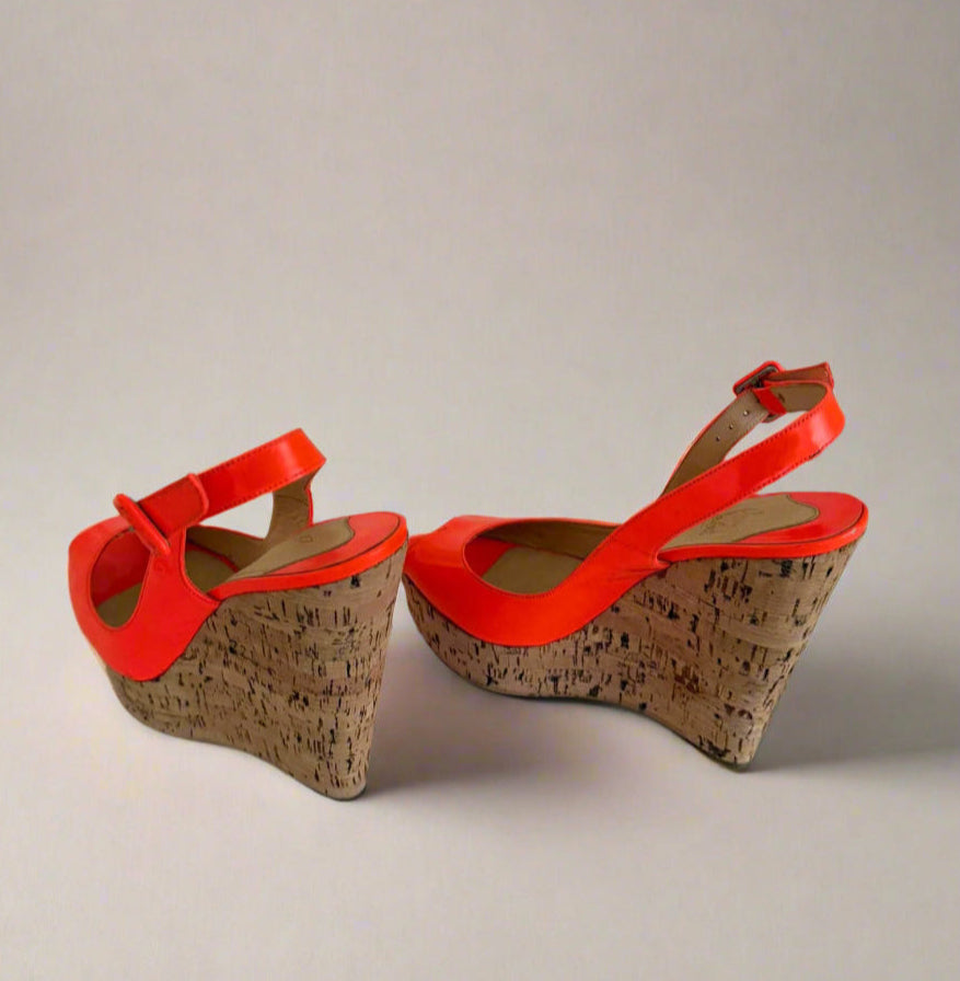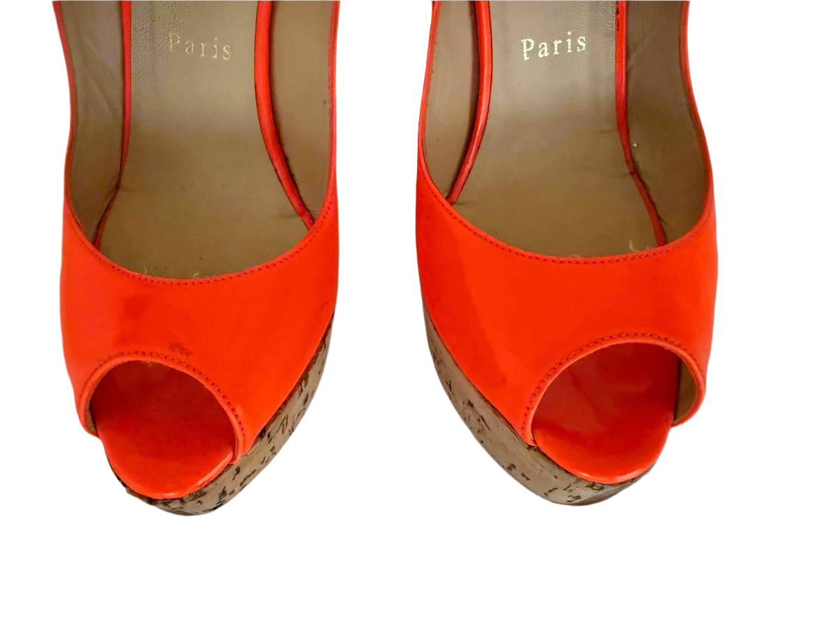 CHRISTIAN LOUBOUTIN Neon Orange Leather Une Plume Cork Wedge Platform Peep Toe Slingback Sandals Size 38