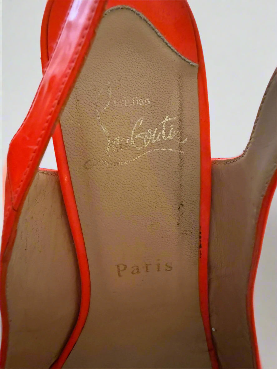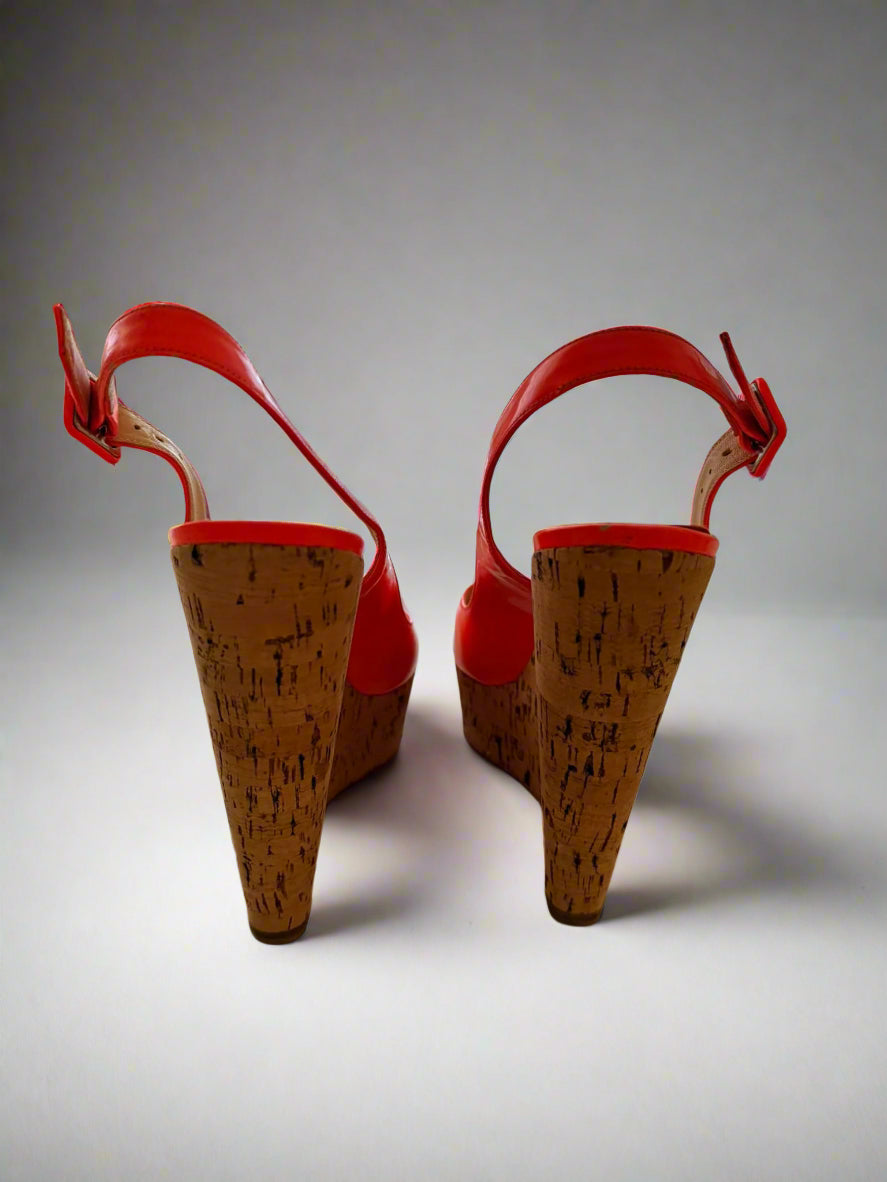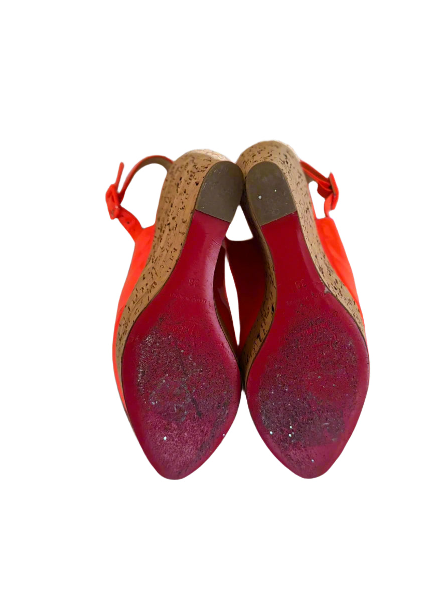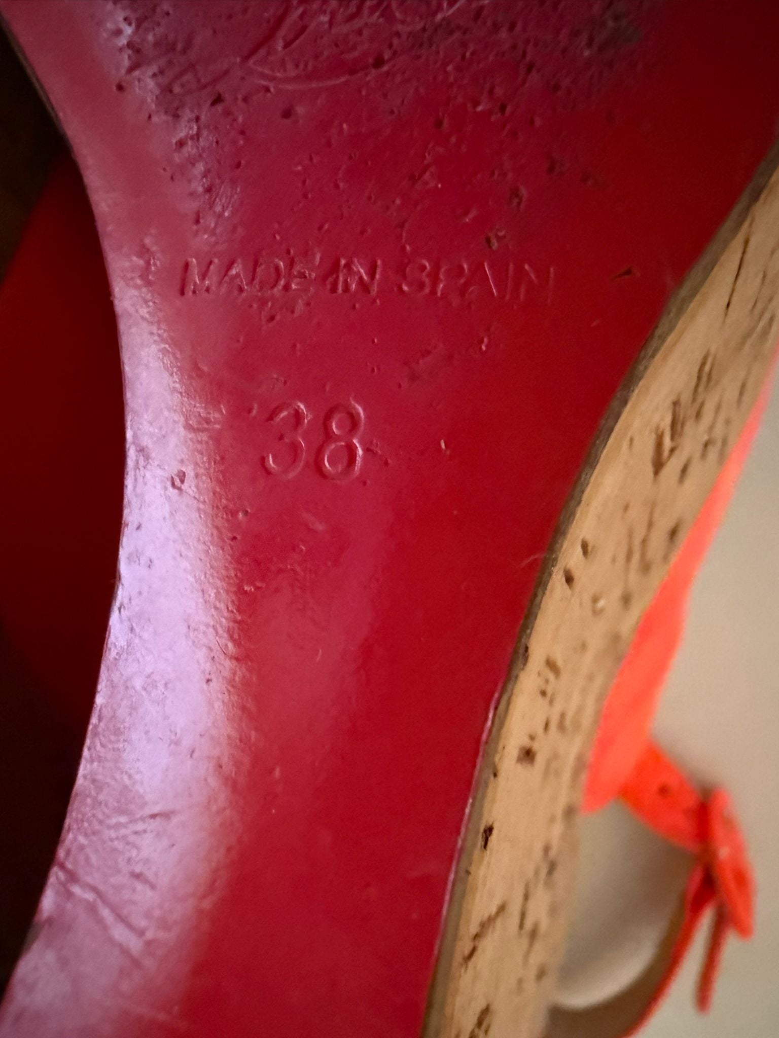 CHRISTIAN LOUBOUTIN Neon Orange Leather Une Plume Cork Wedge Platform Peep Toe Slingback Sandals Size 38