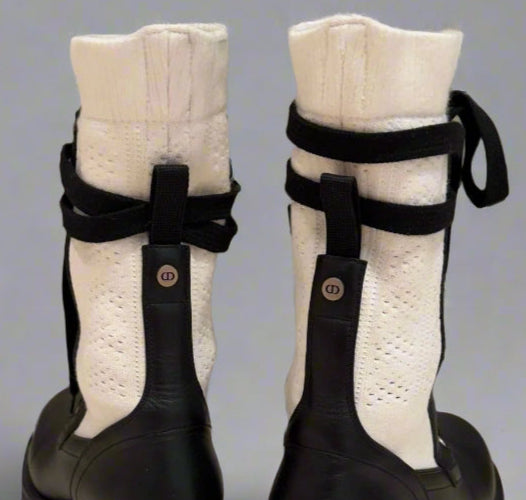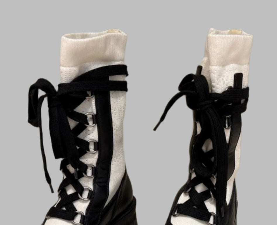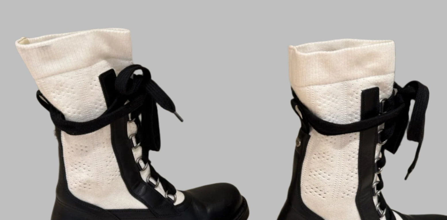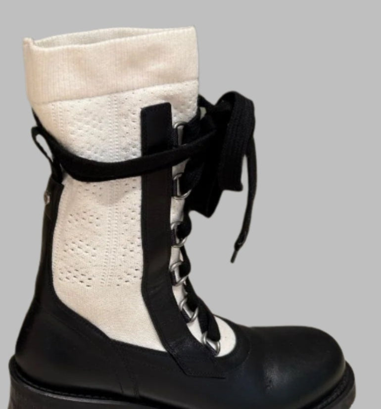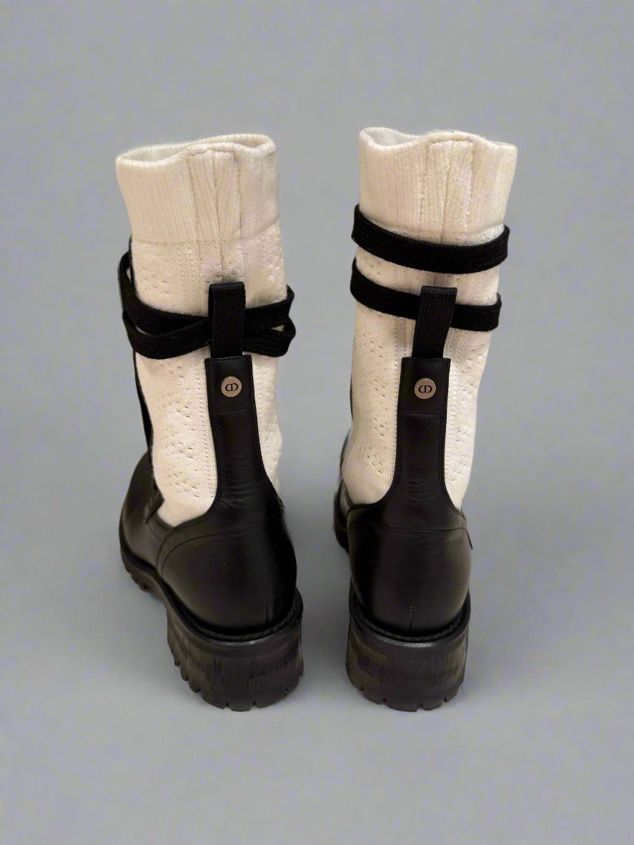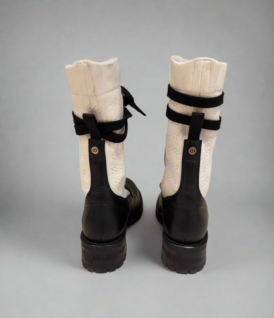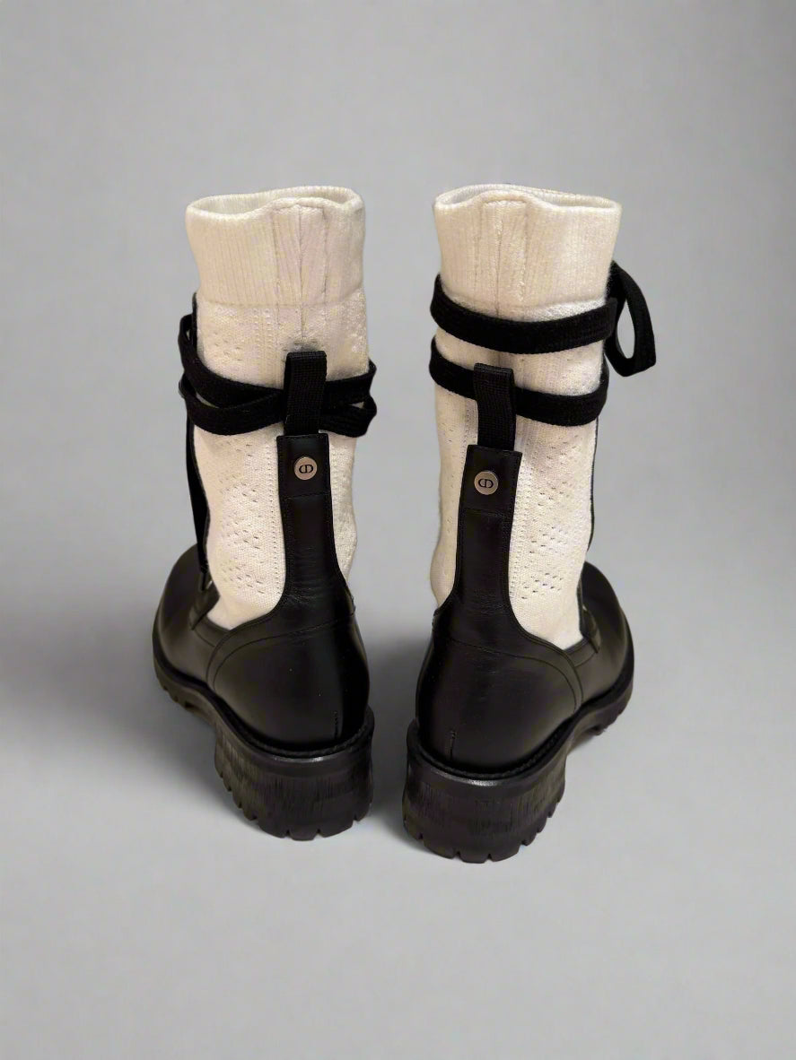 CHRISTIAN DIOR Black Leather & White Knit Lace-Up Combat Boots – Size 38 | Luxury Designer Footwear