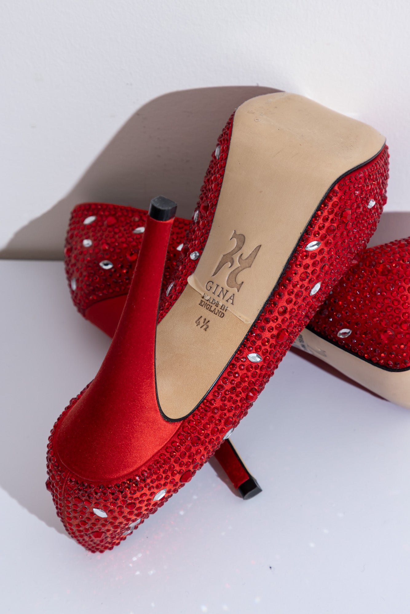 Эти красные атласные туфли-лодочки на платформе GINA с открытым носком, украшенные кристаллами, заявят о себе гламурно. Эти туфли-лодочки, изготовленные в Англии, имеют ярко-красный атласный верх, украшенный сверкающими кристаллами, излучающими элегантность и изысканность. Дизайн с открытым носком добавляет привлекательности, а подошва на платформе обеспечивает дополнительную высоту и комфорт. Эти туфли-лодочки размером UK 4,5 идеально подходят. Они находятся в новом, неношеном состоянии, что обеспечивает первозданный и роскошный вид. Дополните свою коллекцию обуви изысканными туфлями на платформе GINA, изготовленными в Англии с особым вниманием к деталям.
