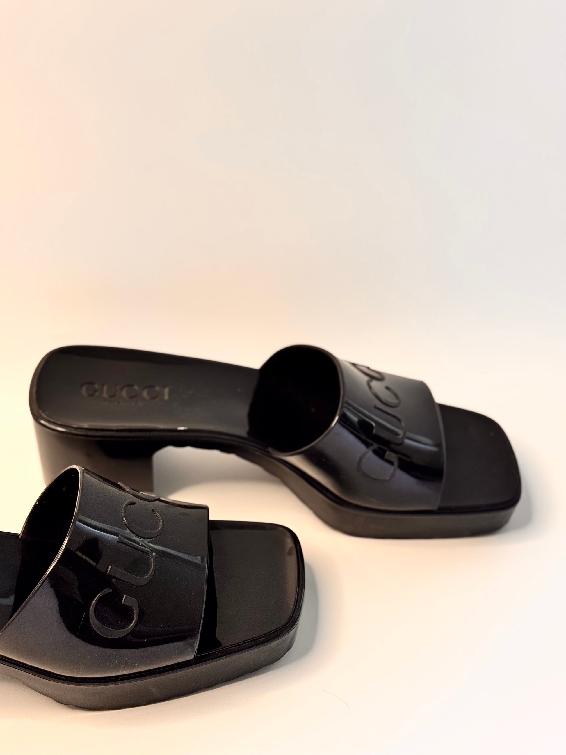 Step into iconic luxury with these GUCCI Black Rubber Logo Slide 60mm Logo-Embossed Sandals , size 38. These sandals are in brand new condition , having never been worn, ensuring they are ready to elevate your style effortlessly. The sleek black rubber design is complemented by the signature GUCCI logo embossing, making them a statement piece for any occasion.